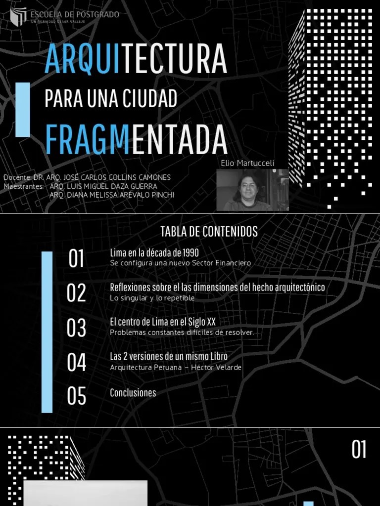 Arquitectura para una ciudad fragmentada, un libro reeditado por elio martuccelli después de 17 años, el arquitecto e historiador elio martuccelli reedita un libro clave para entender los cambios producidos en lima a lo largo del siglo xx... Este texto da cuenta de la evolución de ideas, proyectos y edificios, que aparecen en íntima relación con otros cambios sociales; Arquitectura para una ciudad fragmentada.. 9 introducción 13 capítulo primero la interpretación del hecho arquitectónico 23 la historiografía de la arquitectura contemporánea en el perú 23